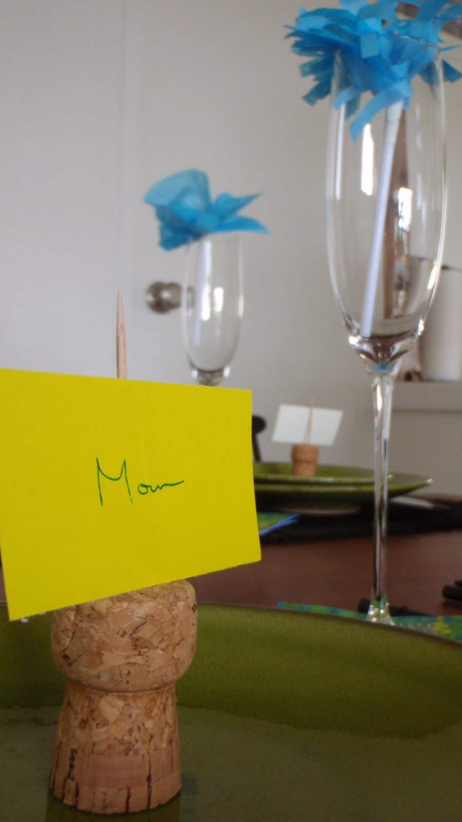 I made these place card holders for Mother's Day Brunch. To do it yourself, just pierce a champagne cork with a toothpick. Then you can lean a hand written name card against the toothpick or attach with a small bead of glue. Easy!