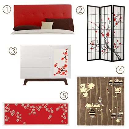 1. Skyline Furniture Button Tufted Headboard in Red 2. Oriental Furniture 72" Cherry Blossom Decorative Room Divider 3. Muu Sam Dresser in Red Blossom Panel Design 4. Twinkle Living Cherry Blossom Rug 5. Sitcom Furniture Keiko Blossom Wall Art